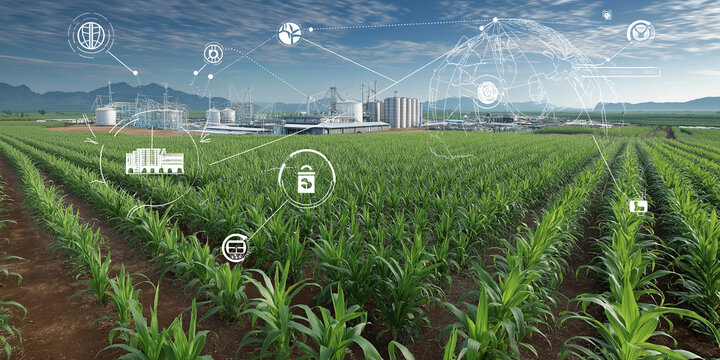 A futuristic robot interacts with holographic technology in a lush agricultural field, blending AI with farming.