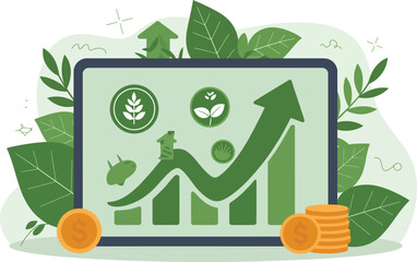 Digital tablet displaying a green growth chart with agricultural icons and coins symbolizing sustainable farming success