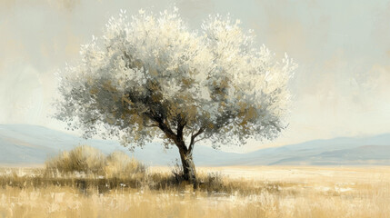 Textured oil painting of an olive tree in a golden field with a hazy, muted background suggesting distant hills.