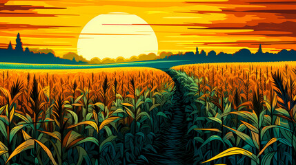 Panoramic view of an agricultural field with wheat in the background and a wooden barn. Sketch illustration.