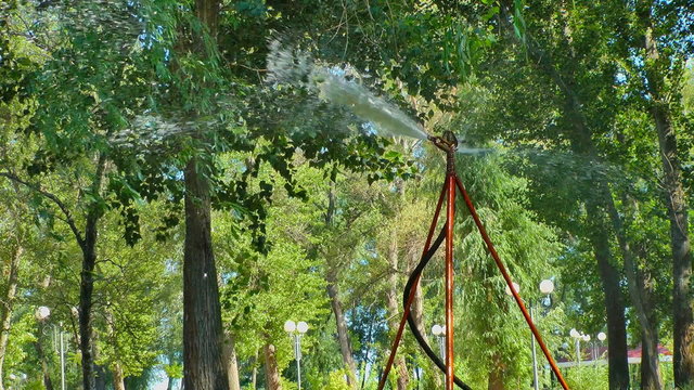 Sprinkler irrigating grass lawn with water in summer garden. Watering green vegetation during dry season for maintaining it fresh.