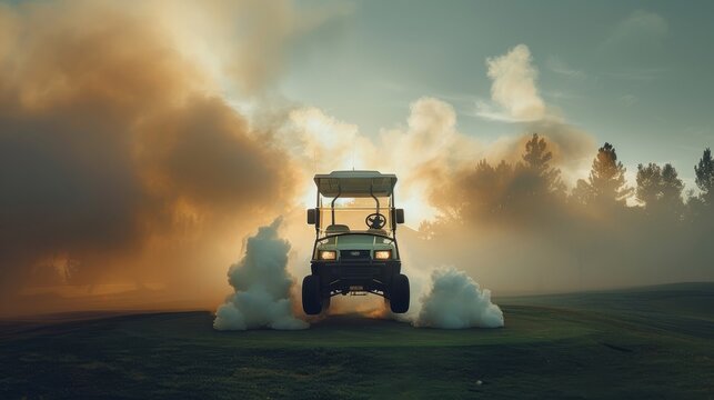 Golf cart flying through air. just took off a jump. on golf course seen from behind with smoke around it. Generative AI.