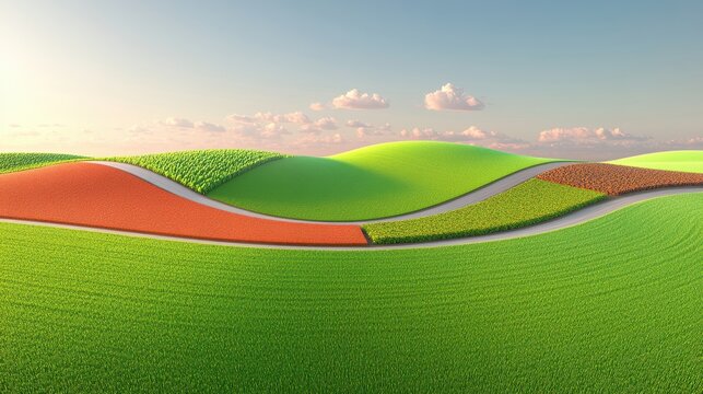 An imaginative 3D top-down illustration depicting an abstract rural landscape featuring a charming farmhouse, a vibrant barn, and a lush vegetable garden, capturing the essence of agricultural indust