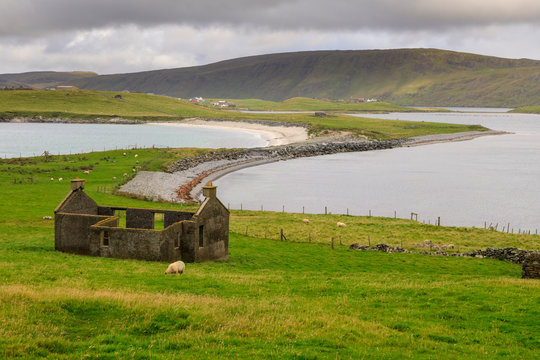 Minn Beach, ruined crofthouse, Banna Minn, tombolo, Papil, West Burra Island, view to East Burra, Shetland Isles, Scotland