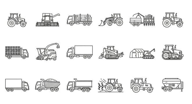 Sleek line art icon set of agricultural machinery and farm transport. Collection of modern vector illustrations for farming and harvest concepts