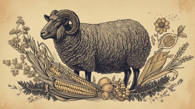 A beautifully detailed vintage-style illustration of a black sheep surrounded by botanical elements such as corn, leaves, and herbs. The aged paper texture adds to its antique appeal. AI generated.