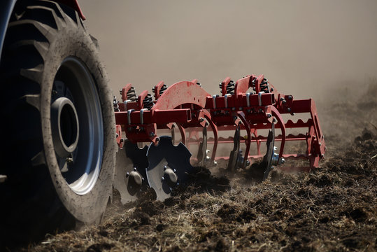 blue new tractor with red harrow in the field against a cloudy sky, agricultural machinery work