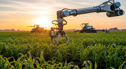 Innovative robotic arm tending crops in a field, showcasing modern agricultural technology and automation on a bright and fertile day