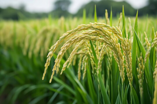 Rice stalks with grains in field. Agricultural landscape. Crop cultivation and farming concept. Image with copy space for food industry, agricultural reports, and sustainable development presentations