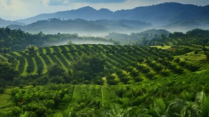 Agricultural landscape with fields and mountains in the distance, suitable for use in presentations or as a backdrop