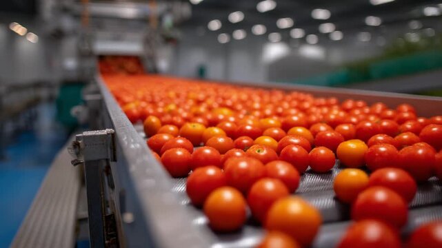 Fresh ripe tomatoes on conveyor belt in modern food processing facility