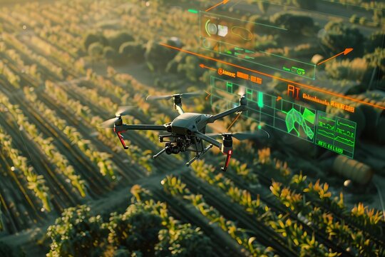 An agricultural drone flying over a farm, with a display showing predictive crop health analytics based on AI analysis