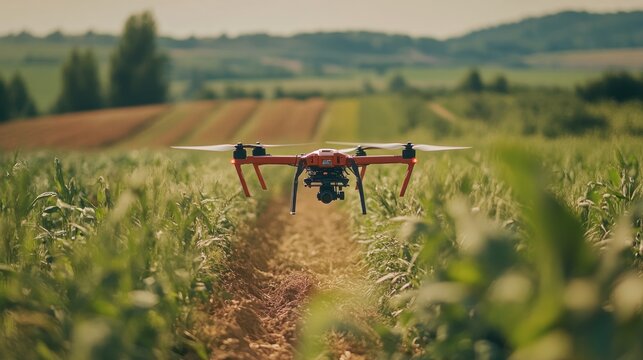 A drone flying low over a crop field, possibly being used for agricultural monitoring, with a backdrop of a green landscape under a clear sky.