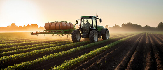 Aerial view Agricultural tractor sprays field with wheat with pesticides and herbicides at sunset spring zoom. Agricultural work on agricultural farm. Nature
