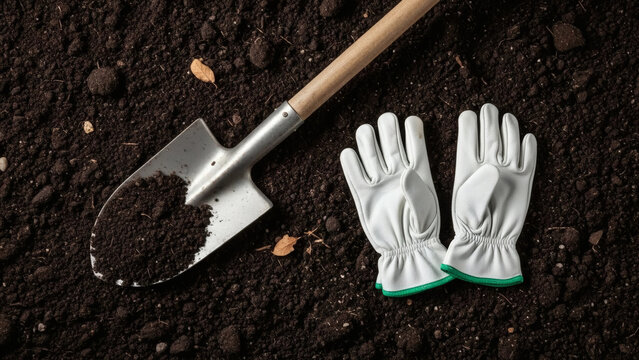 Agricultural tools on soil background shovel and gloves farming concept simple composition