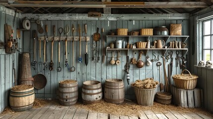 Historic Wooden Barn Interior with Hay Bales & Farm Tools