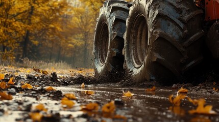 Muddy tractor tires in autumn leaves. Illustrates harsh conditions or agricultural work.