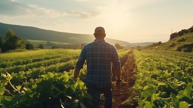Overhead view of a farmer with a straw hat examining soybean plants in a lush field.