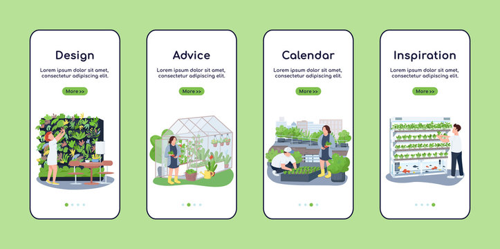 Landscape design onboarding mobile app screen flat vector template. Gardener advice and calendar. Walkthrough website steps with characters. UX, UI, GUI smartphone cartoon interface, case prints set