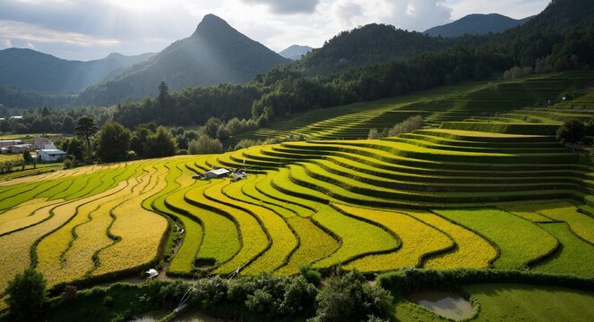 Beautiful Sunset on terraced rice field in harvest season in Mu