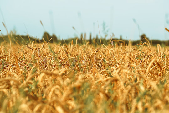 Field with wheat ears at sunset, Food crisis and world hunger concept, Growing wheat sprouts closeup, Harwest problem