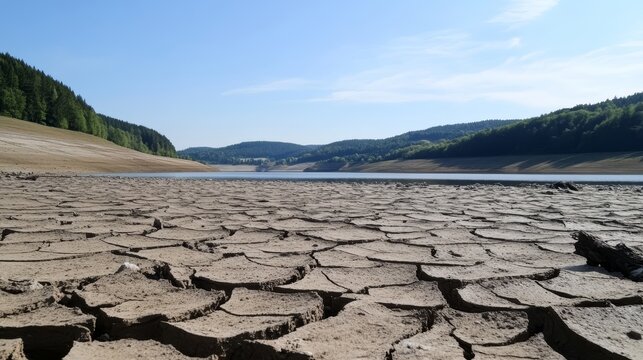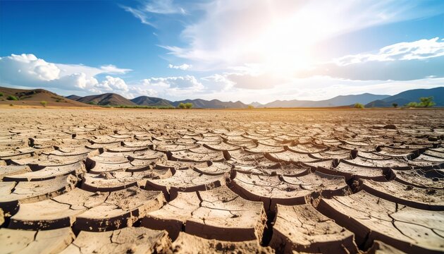 Cracked dry earth under a blue sky with clouds and distant mountains