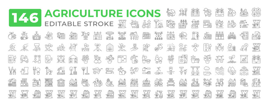 Farming and agriculture outline symbol collection. 65 editable stroke icons. Vector illustrator