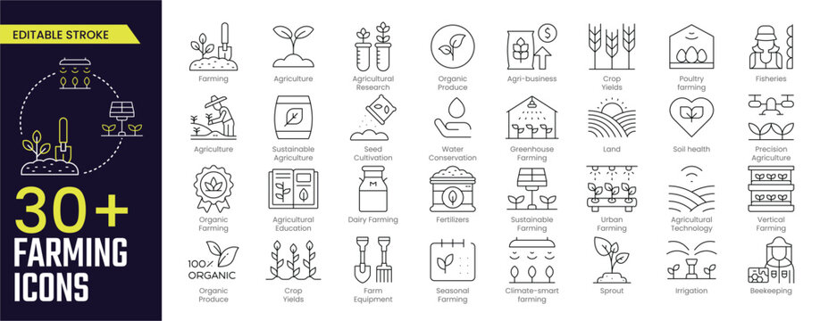Simple set of vector line icons related to agriculture. Contains barn, livestock, tree garden and more.