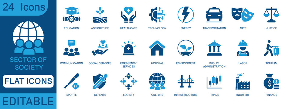 Sector of society icon set. Containing agriculture, education, healthcare, energy, technology, transportation, arts, justice and more. perfect flat icon collection.
