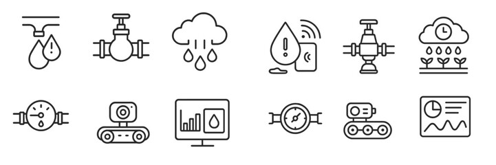 Smart farm simple line icon set. Innovative technologies for managing farm or agriculture. Automatic watering of plants and harvesting. Cartoon flat vector collection isolated on white background