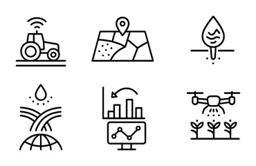 Precision Agriculture Icons. Outline icon set of precision agriculture tools: GPS tractor, field mapping,