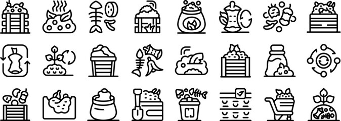Composting icons set. Line icons depicting various aspects of composting, from organic waste collection to fertilizer production