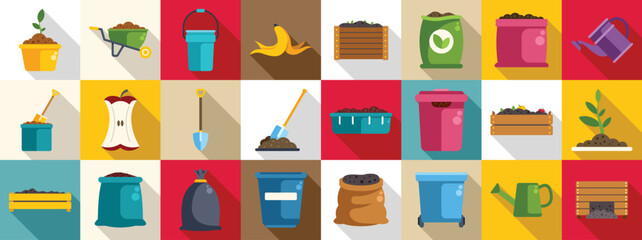 Composting icons set. Colorful compost icons represent the process of composting organic waste, using gardening tools, and growing plants
