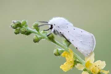 White ermine (Spilosoma lubricipeda), on Common agrimony (Agrimonia eupatoria), Burgenland, Austria, Europe