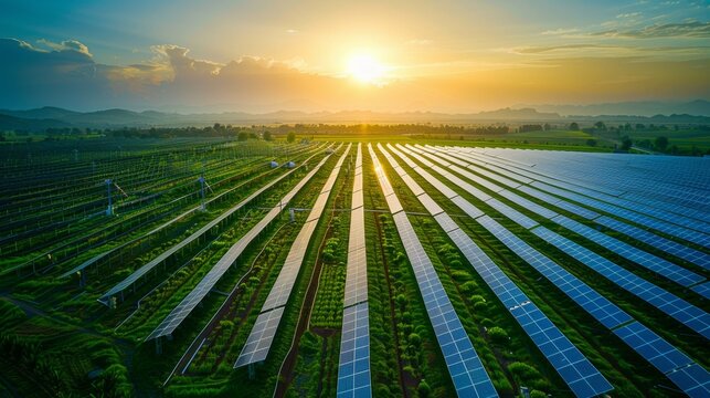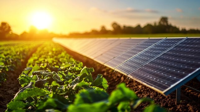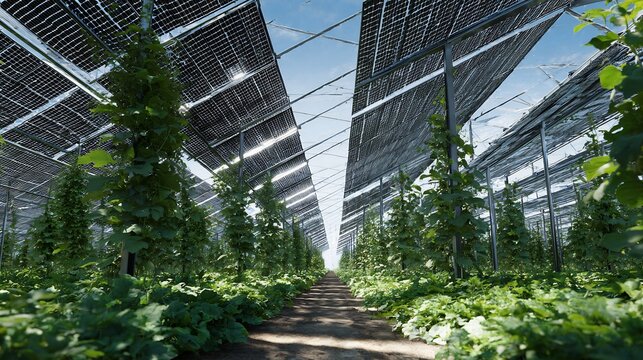 Green crops grow under solar panels on farm. Innovative agrivoltaic system merges renewable energy generation with food production. Maximizes land use, supports sustainable agriculture, shows modern