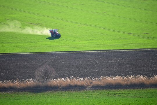 Tractor combine harvester spraying pesticides on soil field with sprayer at spring. Agriculture transport sprayed fertilizer on the farming field.