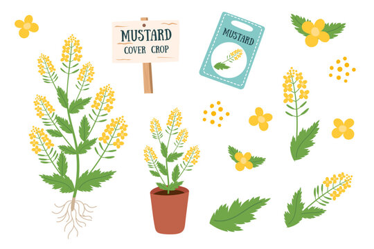 Mustard plant, flowers, leaves cliparts isolated on white. Nature background, cover crop. Gardening, regenerative farming, nature, soil care concept. Vector hand drawn banner.