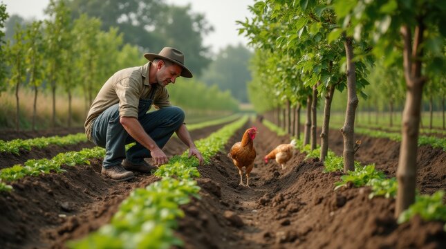 A sustainable agroforestry farm with fruit trees and crops growing together, showing fertile soil and eco-friendly farming methods.