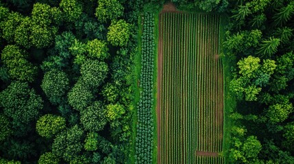 Aerial view of lush tropical agroforestry plantation with morning mist, vibrant green trees, and orderly rows in rural landscape