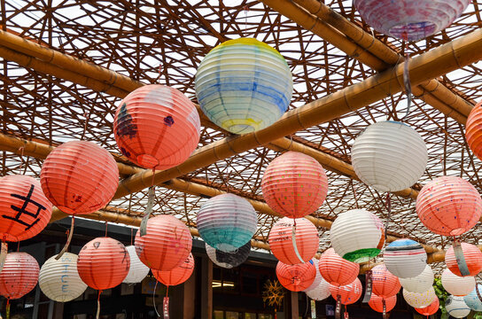 Yunlin, Taiwan - AGU 02, 2019: Many lantern hanging outdoors in Xiluo old street.