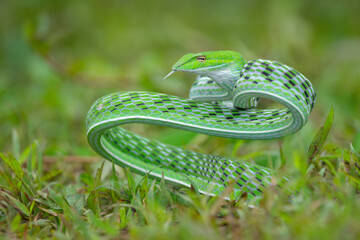 ahaetulla prasina snake ready to attack, green snake on grass, animal closeup