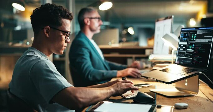 Laptop, typing and business man coding, problem solving or software development in creative startup at night. Programming, computer and person writing data, update algorithm or app with ai engineer
