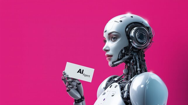 A futuristic AI agent assistant holding a business card as a representative offering artificial intelligence support, customer service and virtual AGI during the singularity