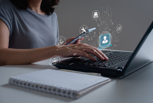Technical support customer service with AI technology concept. Woman uses laptop with VR screen to support customer icon, online it support, call center and customer service help business.