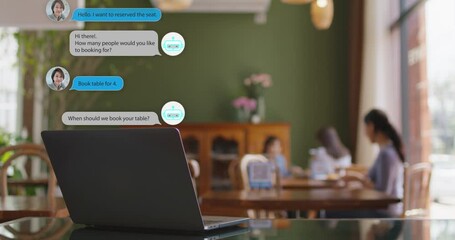 Seamless smart order food or auto reserve seat on social media app platform ask talk or text advice robot meal dining booking retail on laptop. AI chat bot help people for small SME asia B2C CRM IOT.