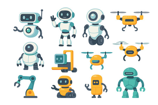 Robot and drone character set. Vector collection of cute modern robots, androids, and quadcopters. Automation technology, AI, and futuristic industrial concepts. Cartoon mascot icons.
