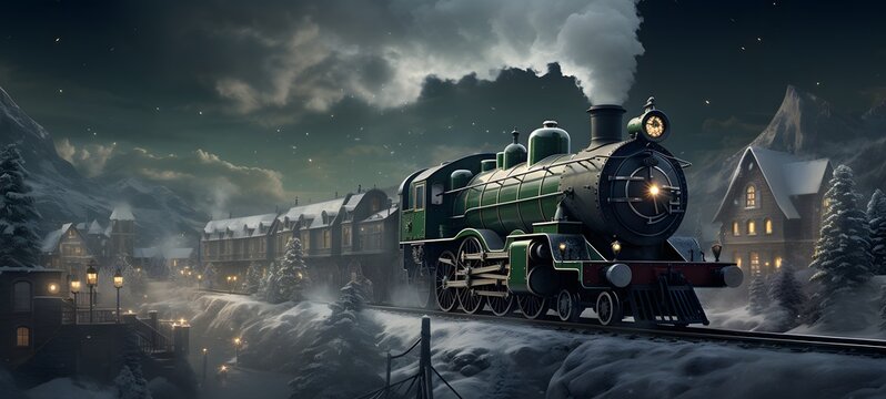 A green steam train with gifts and Santa Claus driving past snow-covered houses in the background ,generative AI