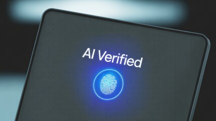 AI driven payment solution concept AI verification symbol on a digital device with a fingerprint icon glowing blue.