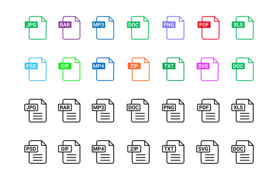 Colorful File Format Vector Icon Set. JPEG, PNG, GIF, BMP, EXE, AI, MP3, ZIP, 7z, PSD, CSS, HTML, JS, SQL, XML, RAR, SVG, PY, OTF, TTF, WAV, ISO, WEBP and Many More.