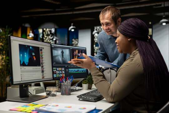 Female expert editor working in video production industry at agency office, doing color grading and creating a montage on dual monitors. Creative process with multimedia tech tools.